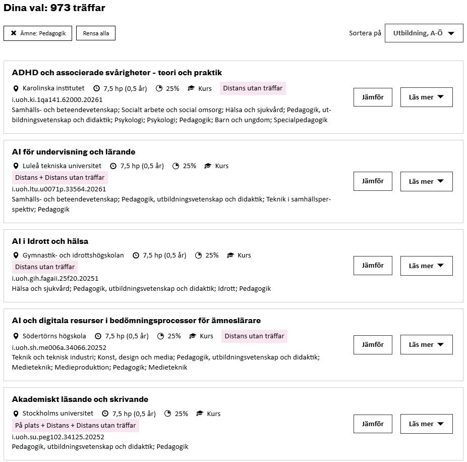 Då får vi fram en träfflista med utbildningar som ges vid olika högskolor och universitet.