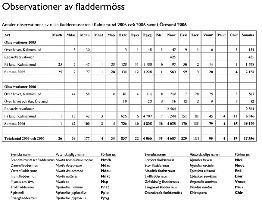 33. Studera antalet observationer över havet i Kalmarsund. Av vilken fladdermusart gjordes nio gånger så många observationer 2006 jämfört med 2005?