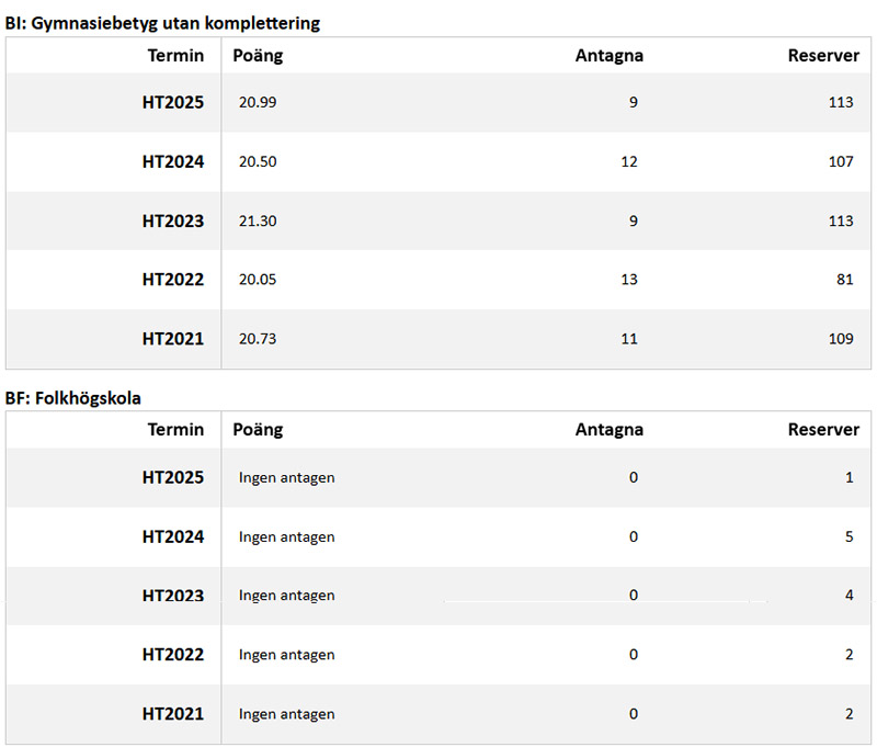 Om antagningsstatistik saknas för ett urval har detta urval inte gjorts.