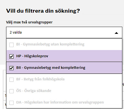 Urvalsgrupp som saknas i listan = Kontrollera med högskolan vad urvalsgruppen står för innan du anmäler dig. Det brukar gå att hitta vad som gäller på deras webbplats.