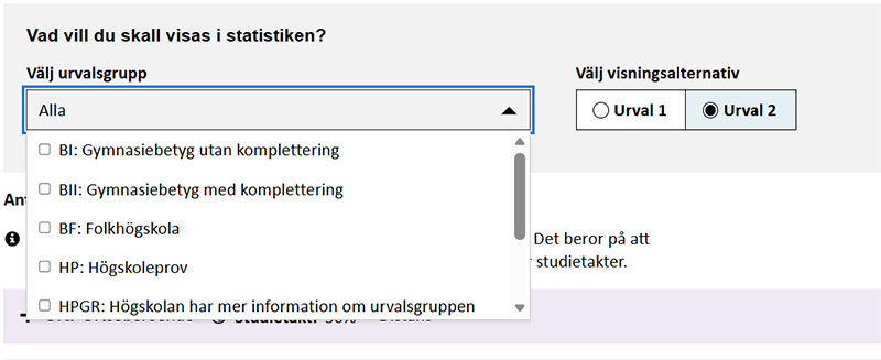 Du väljer också vilket urval du vill se antagningsstatistik, antal antagna och reserver från. För en del utbildningar finns det bara statistik från ett av urvalen.
